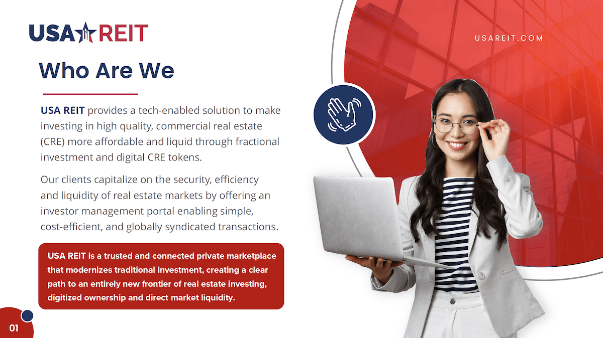 USA REIT provides a tech-enabled solution to make investing in high quality, commercial real estate (CRE) more affordable and liquid through fractional investment and digital CRE assets.