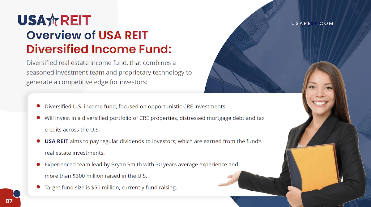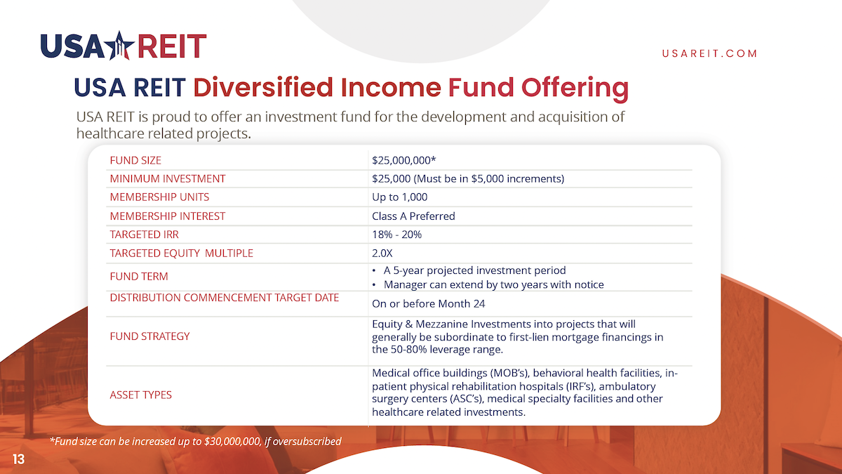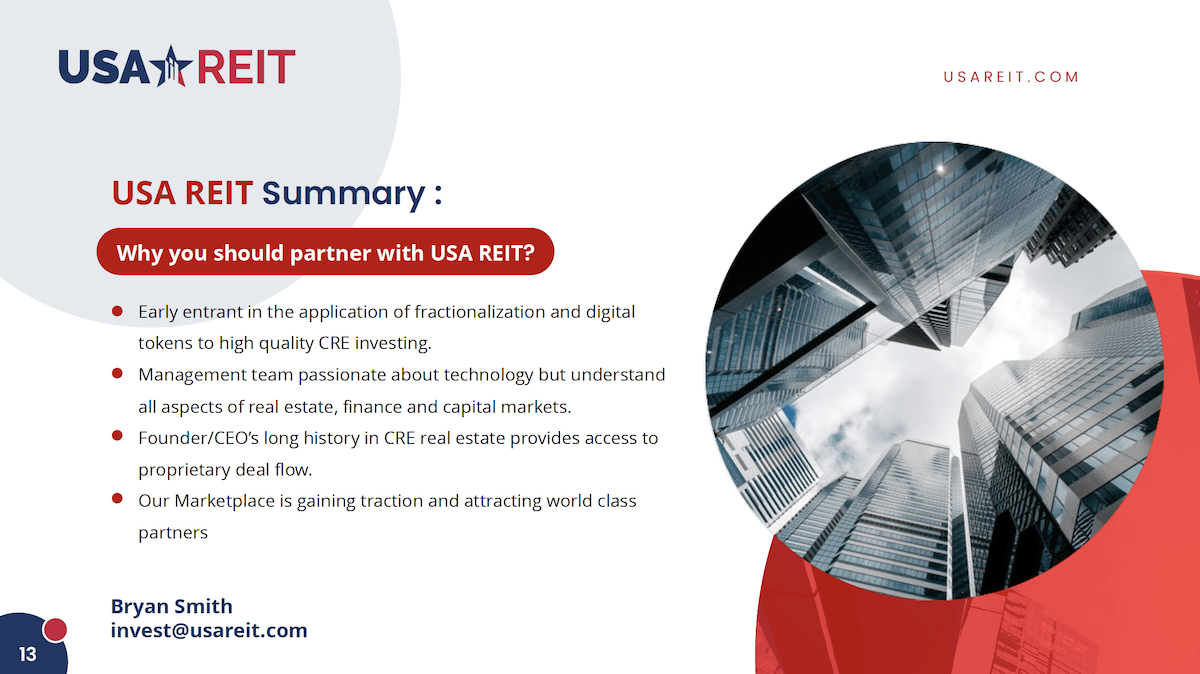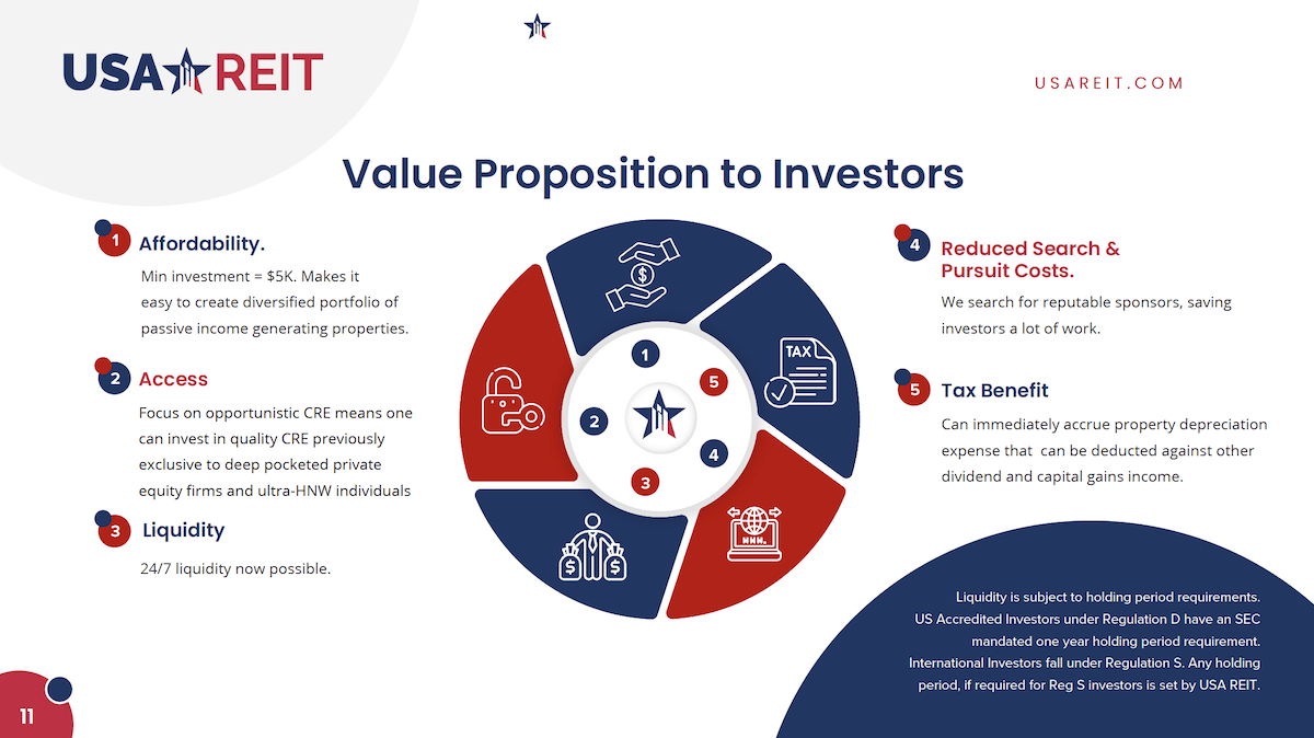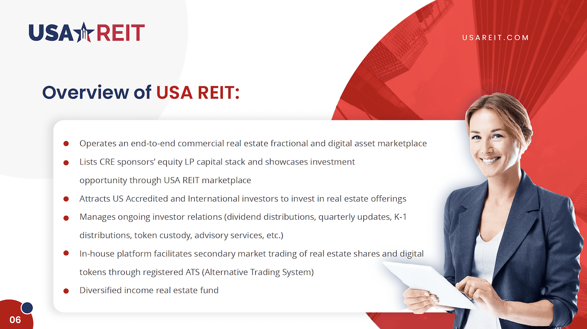 - Lists CRE sponsors’ equity LP capital stack and showcases investment opportunities through USA REIT marketplace