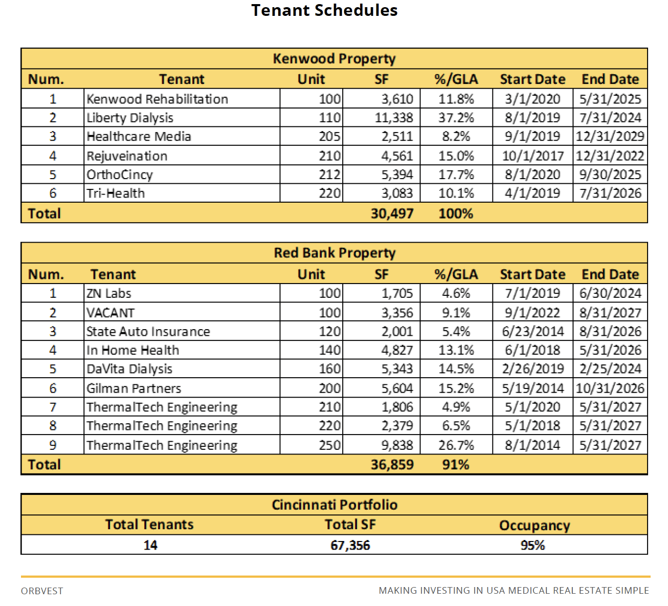 The first property in the Portfolio, Kenwood Crossing II, is located in the Kenwood submarket and was completed in 2008. The property is two stories and is currently 100% occupied. The second property in the Portfolio, Red Bank Village, is located in the Red Bank medical corridor and was completed in 2007. This property is also two stories and is currently 91% occupied. The Red Bank property has one vacant space totaling 3,356 SF. OrbVest plans to effectively advertise this space to lease up in the first year of ownership to boost revenue and occupancy.